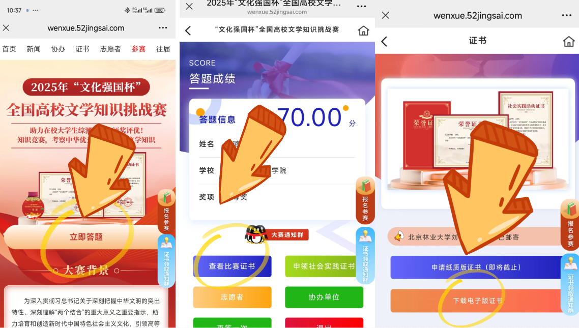 2025年9月25日前答题及格获奖的同学,已可以在个人中心下载电子版获奖证书,下载流程如下。纸质版证书申请暂定10月15日24点截止,请及时申请。